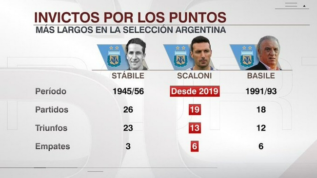 正式比賽中,阿根廷19場比賽,斯卡洛尼帶隊獲得13勝6平,超越了巴西萊在30年前創造的18場比賽不敗的數據(12勝6平),僅次於斯塔比萊創造的連續26場正式比賽不敗(23勝3平)紀錄,而這一紀錄是上世紀四五十年代創造的(1945-1956),距今已有65年。
