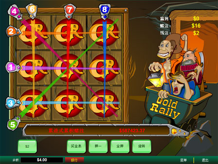 “金色召集”,英文名稱是Gold Rally,也翻譯成“黃金召集”,這是經常在黃金市場消息的時候用到,是一個9卷軸8個派彩線的帶有累積彩池的視頻老虎機遊戲,帶有獎賞環節。最大投注角子是8個,每個角子(籌碼)面值是$2美元(¥15人民幣),因此一次旋轉的最大賭注是$16美元。