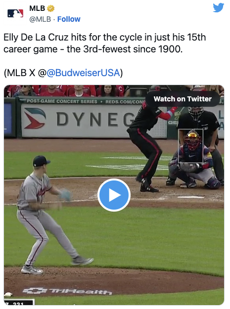 辛辛那提紅人21歲超級新秀克魯茲(Elly De La Cruz)在今天對上亞特蘭大勇士的比賽,只用了6局就搞定完全打擊,而這只是他大聯盟生涯第15場比賽,能在這麼短的時間內就在大舞台名留青史,就連球隊39歲老大哥沃托(Joey Votto)都稱讚他:「不屬於這個世界。」